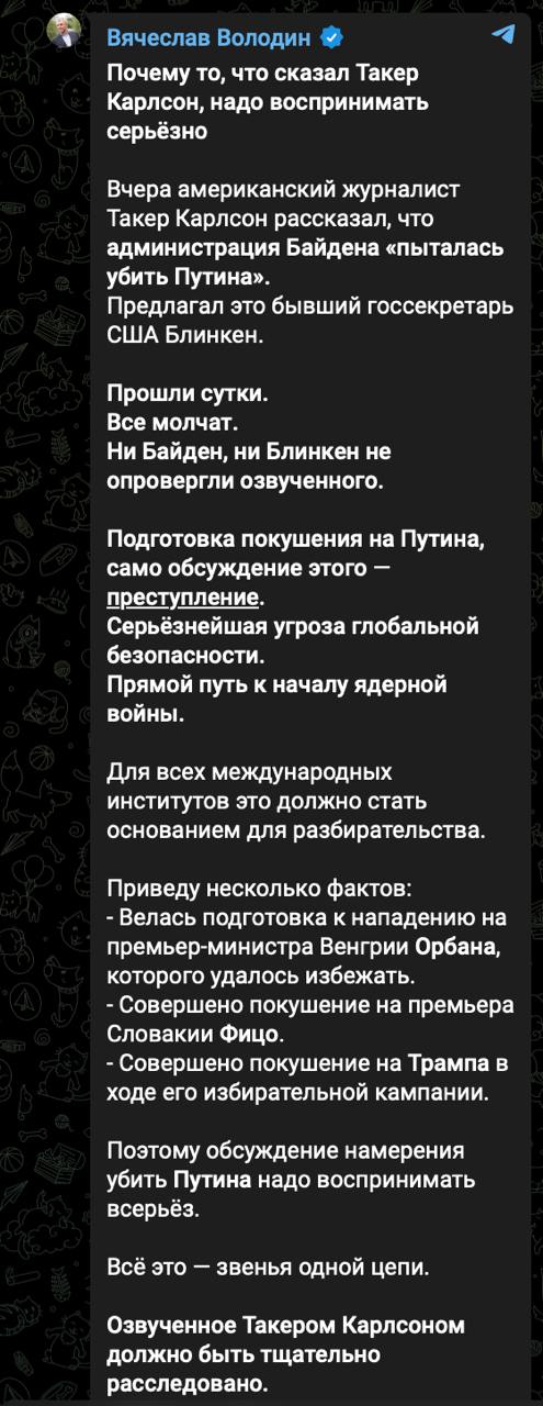 Он напомнил о покушениях на Дональда Трампа и премьер-министра Словакии Роберта Фицо и заявил, что "обсуждение намерения убить Путина надо воспринимать всерьёз". Также Володин призвал "привлечь к ответственности" Блинкена и Байдена.