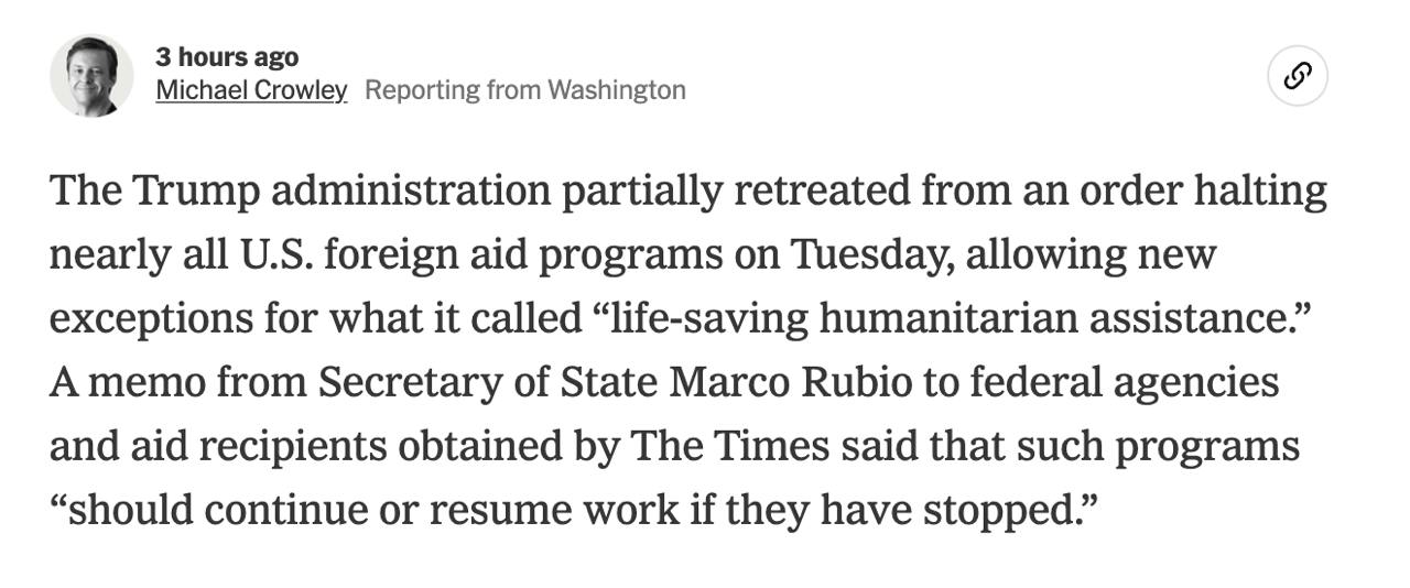 Между тем NYT пишет, что администрация Трампа возобновила выплаты грантов на некоторые ранее приостановленные им программы иностранной помощи.