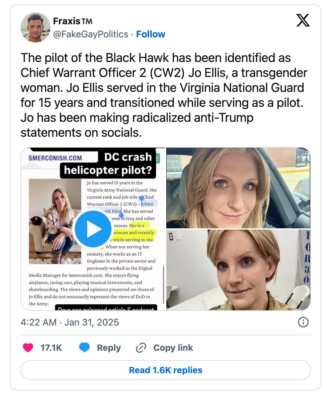 "По слухам, трансгендерная женщина Джо Эллис была пилотом вертолета Black Hawk, который столкнулся в воздухе с самолетом American Airlines. Хотя ее личность привлекла значительное внимание в социальных сетях, информация остается официально неподтвержденной властями", - пишет Santa Monica Observer.