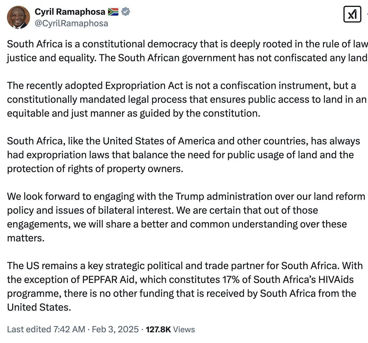 Президент ЮАР Сирил Рамафоса уже ответил Трампу, написав в Х, что его правительство "не конфисковало ни одного участка земли", а недавно принятый закон - "это не инструмент конфискации", а документ, "обеспечивающий общественный доступ к земле на равноправной и справедливой основе".