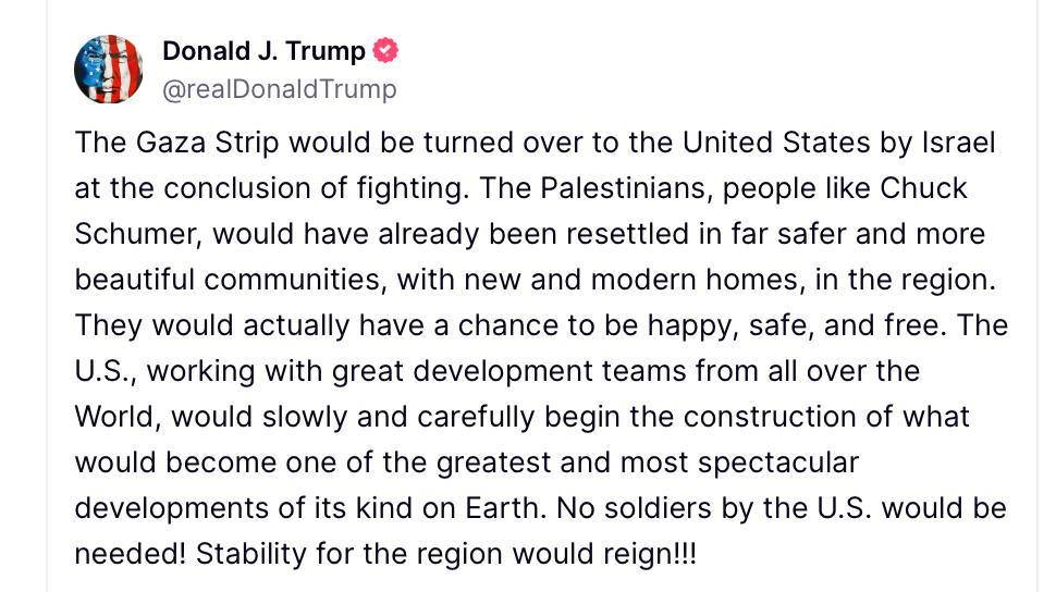 Трамп пишет, что "сектор Газа будет передан США Израилем по завершении боевых действий", а палестинцев переселят "в гораздо более безопасные и красивые общины, с новыми и современными домами", у них появится "шанс быть счастливыми, в безопасности и свободными".