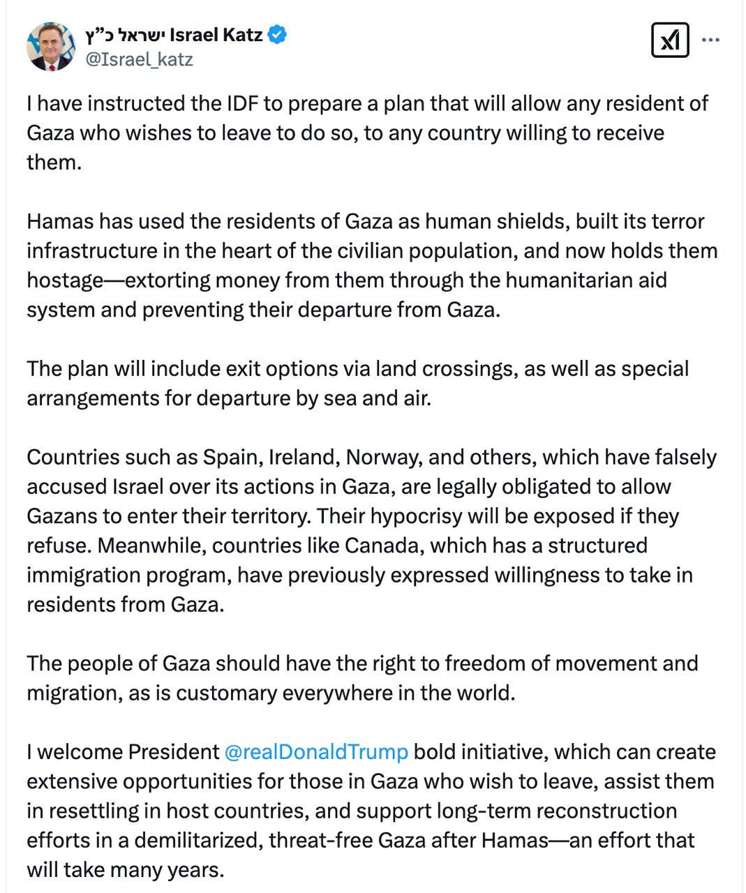 В то же время министр обороны Израиля Исраэль Кац сообщил, что уже поручил армии разработать план реализации идеи Трампа переселить палестинцев из сектора Газа в другие страны, а эту территорию взять под американский контроль.
