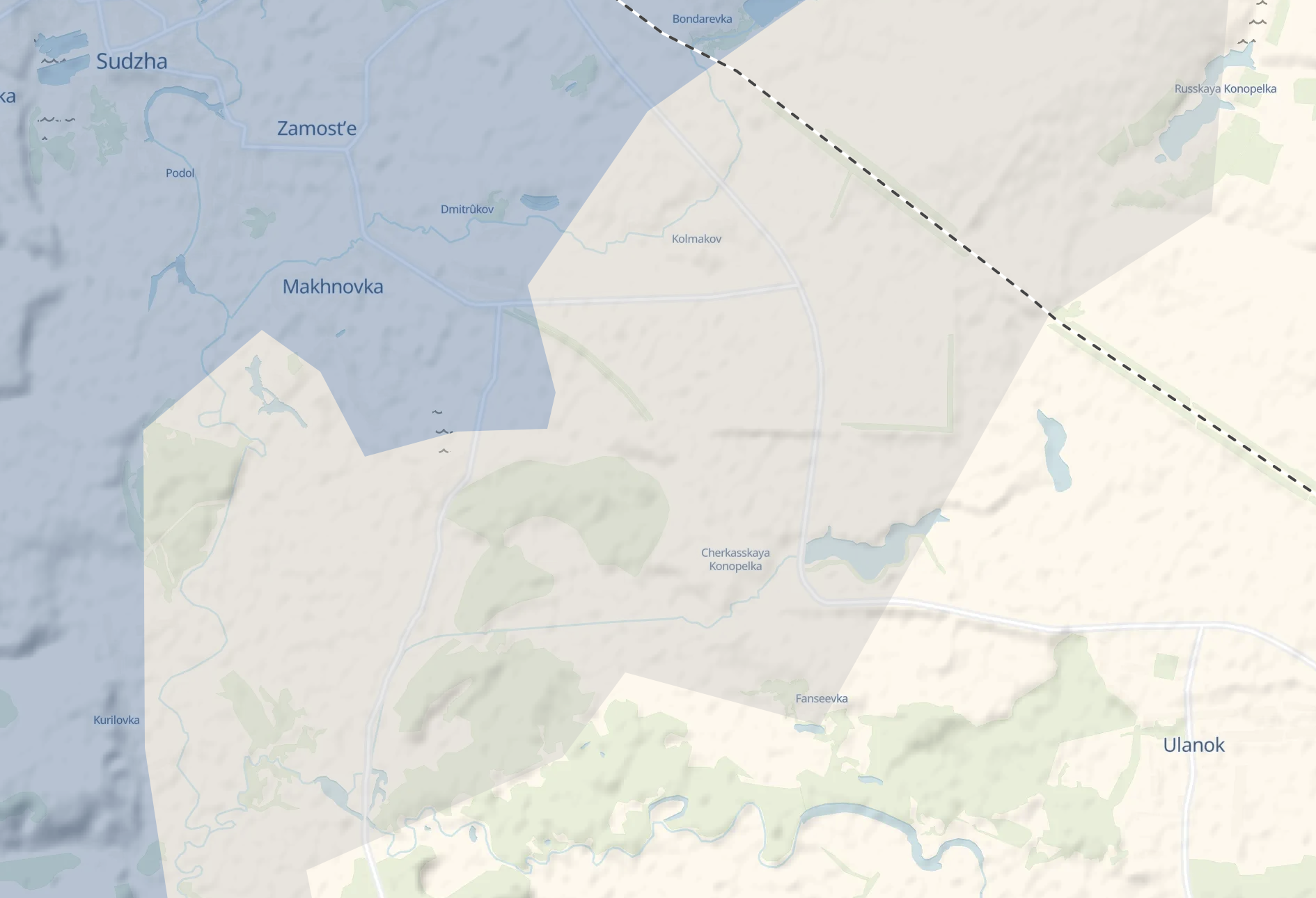 При этом до вероятной главной цели наступления деревни Уланок - как заявляют российские телеграмм-каналы, украинские штурмовые группы не дошли, будучи остановлены российскими войсками, и заняли ряд посадок, за которые бои продолжаются до сих пор. Россияне заявляют о купировании попыток перебросить к этим группам подкрепления и утверждают, что бои сейчас позиционные. О новых крупных атаках ВСУ сегодня информации не поступало.