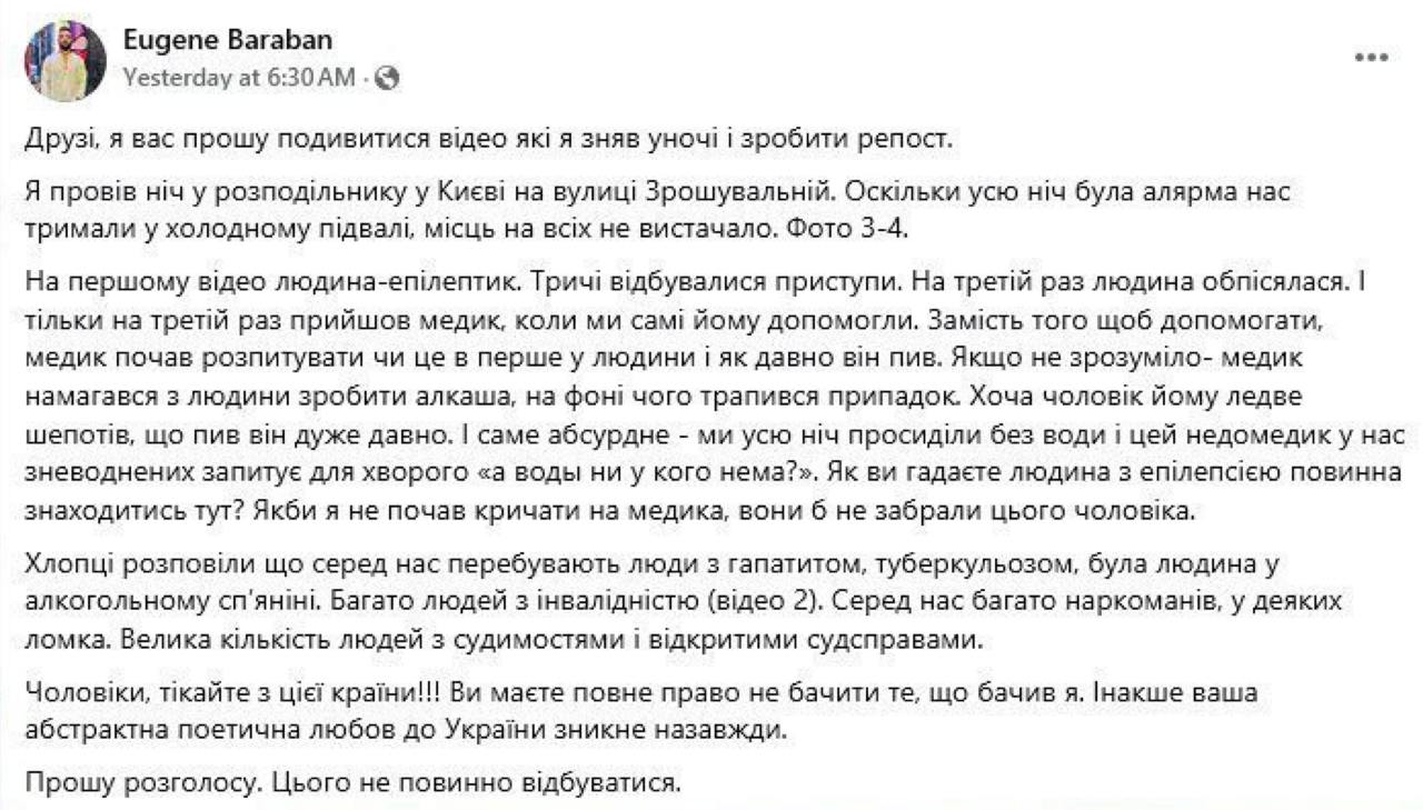 Члены военно-врачебной комиссии объявили ему, что делают своё заключение на основании электронной базы eHealth, где не оказалось никаких данных о перенесении ранее Барабаном операций и наличии дефектов сердца. После чего Евгения "запихали в бус" и увезли из Соломенского ТЦК на распределительный пункт по улице Оросительная (вызов полиции не помог, так как наряд просто не пустили в ТЦК).