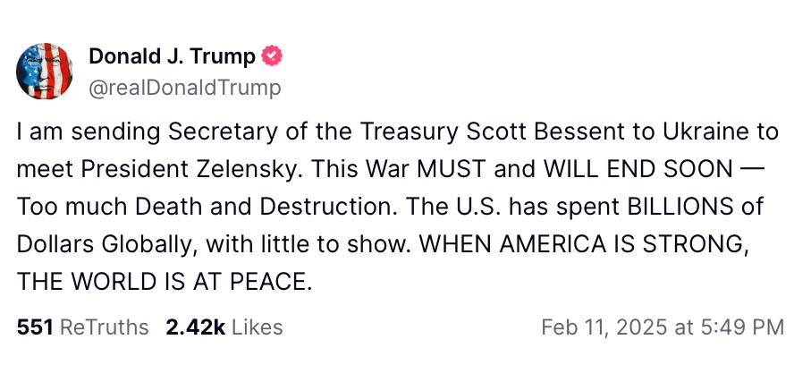 "Я отправляю министра финансов Скотта Бессанта в Украину для встречи с президентом Зеленским. Эта война должна скоро закончиться - слишком много смертей и разрушений. США потратили миллиарды долларов по всему миру, но мало что показали", – написал президент США.