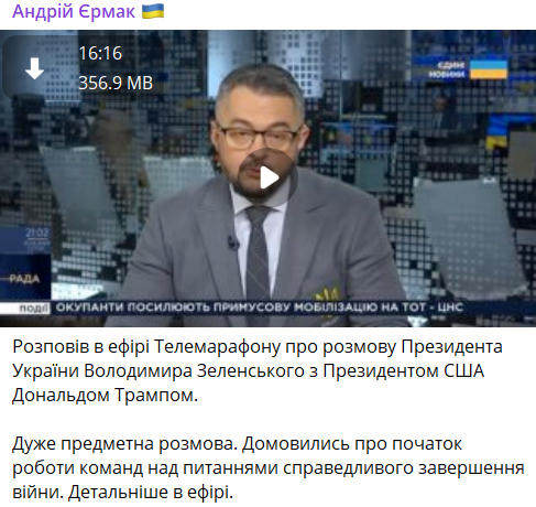 Ермак сообщил, что Трамп и Зеленский договорились о немедленном начале работы команд по завершению войны