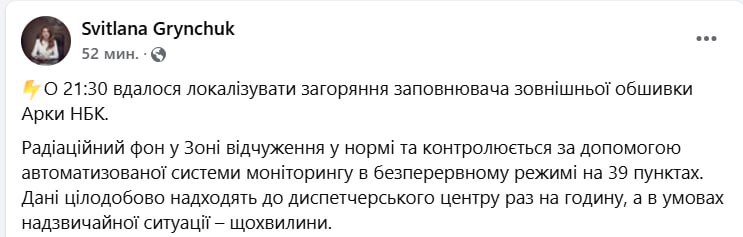 А министр экологии Светлана Гринчук заявила, что на Чернобыльской атомной станции в 21:30 локализовали возгорание на наружной обшивке укрытия. Она тоже заверила, что радиационный фон в норме.
