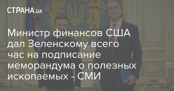 Американский министр финансов Скотт Бессант в ходе визита в Киев дал президенту Владимиру Зеленскому всего час на подписание американского меморандума с требованием передать США все минеральные богатства страны.