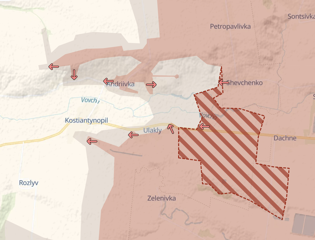 В Донецкой области россияне захватили «карман» к югу от Дачного в «Андреевском мешке», свидетельствует карта Deep State. Украинский боец «Мучной» сообщает, что идут «серьезные накаты на Константинополь», при этом часть украинских сил остались в селе Улаклы без связи с внешним миром. В само Улаклы, по данным "Мучного", уже вошла российская армия.