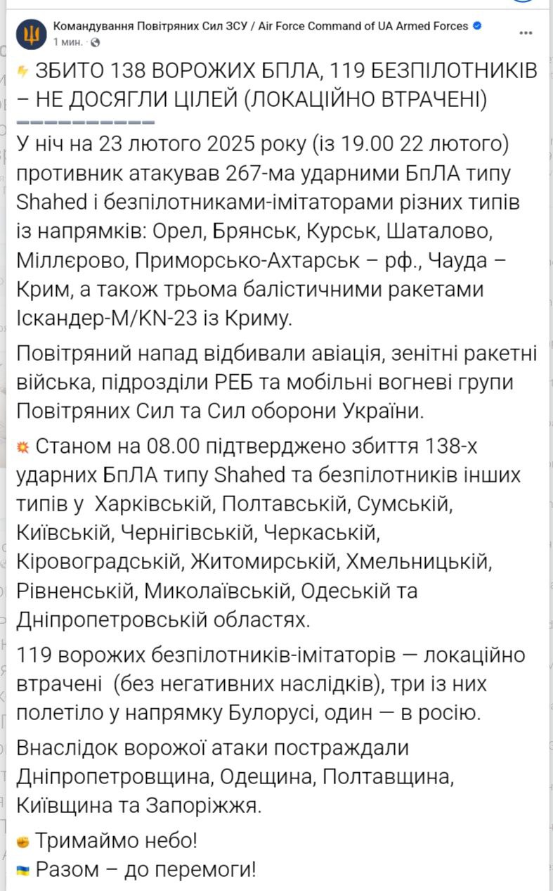 Ночью Украину атаковали сразу 267 беспилотников разных типов. 138 из них сбили, а 119 "локационно утрачены".
