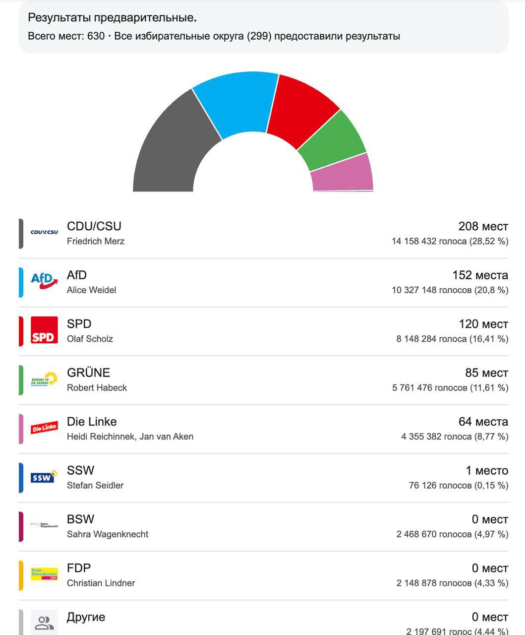 "Исходя из итогов выборов в Германии наиболее вероятная коалиция в новом Бундестаге будет состоять из победителя выборов - ХДС/ХСС Мерца (он станет канцлером) и СДПГ Шольца (но уже, скорее всего, без нынешнего канцлера).