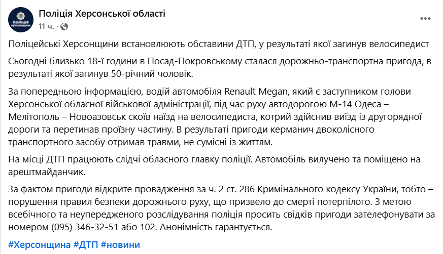 Заместитель начальника Херсонской областной военной администрации вчера насмерть сбил 50-летнего велосипедиста.