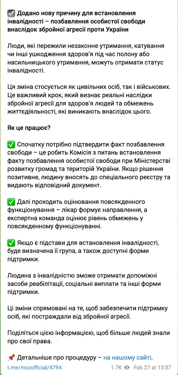 "Люди, пережившие незаконное содержание, пытки или другие повреждения здоровья во время плена или насильственного содержания могут получить статус инвалидности", - говорится в сообщении ведомства.