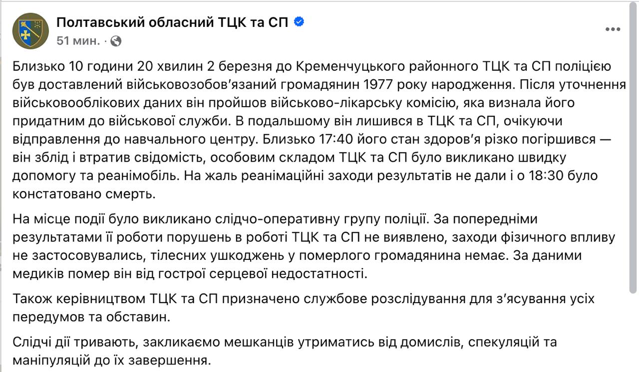 11.36 В Кременчугском ТЦК умер мобилизованный вскоре после прохождения ВВК, сообщает Полтавский военкомат.