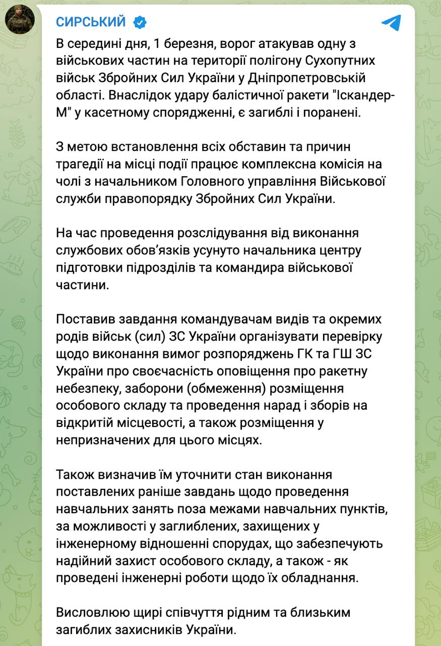 14.59 На время расследования ракетного удара по полигону в Новомосквоске, где погибли много военных, от выполнения служебных обязанностей отстранены начальник центра подготовки подразделений и командир воинской части.