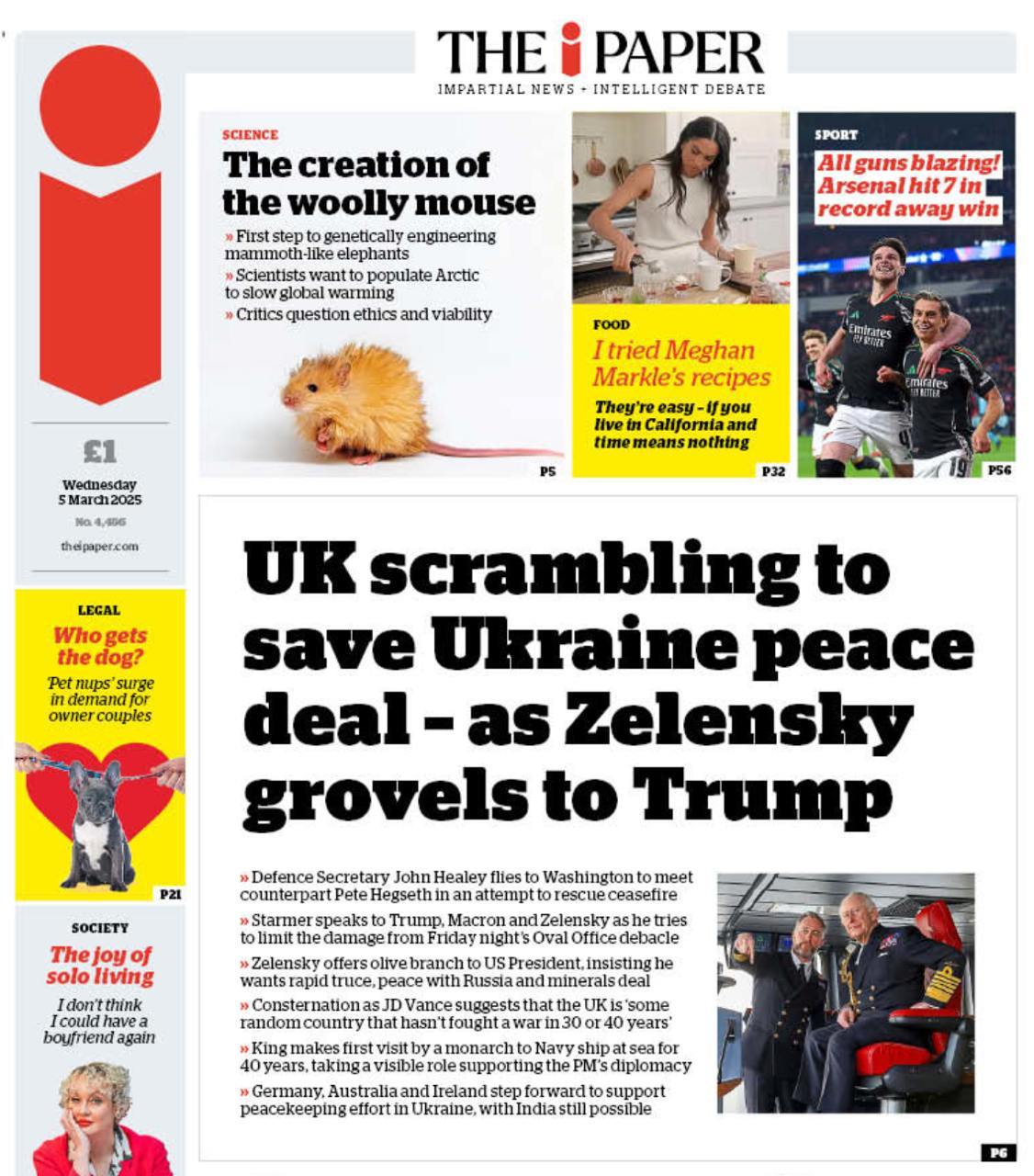 Приложение этой газеты - ежедневка The i Paper - пишет, что "Зеленский унижается перед Трампом", а "Великобритания отчаянно пытается спасти мирное соглашение об Украине".