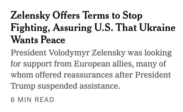 Похожий по смыслу заголовок с элементом сомнения в словах украинского президента публикует американская The New York Times: "Зеленский предлагает условия для прекращения боевых действий, заверяя США, что Украина хочет мира".