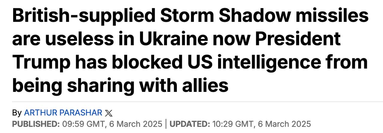 "Поставляемые Британией ракеты Storm Shadow бесполезны в Украине теперь, когда президент Трамп заблокировал передачу американских разведданных союзникам", - говорится в статье.