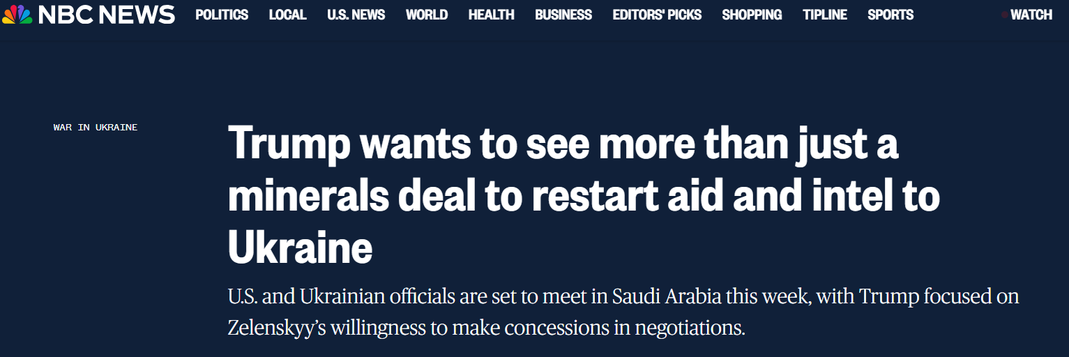 "На этой неделе в Саудовской Аравии должна состояться встреча официальных лиц США и Украины, при этом Трамп сосредоточит внимание на готовности Зеленского пойти на уступки в ходе переговоров", - пишет NBC.