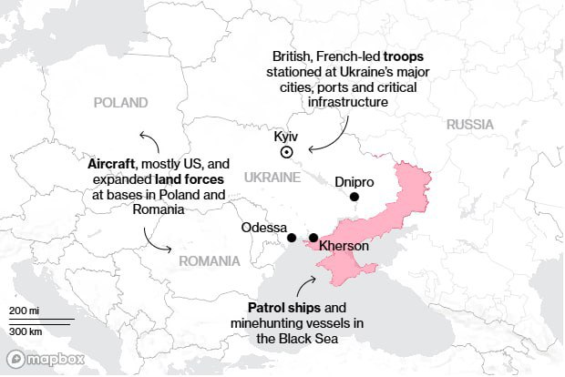 "По наиболее вероятному плану британские и французские миротворцы разместятся в основных городах, портах и на объектах критической инфраструктуры Украины. В Черном море планируется дислоцировать патрульные корабли и минные тральщики", – пишет Bloomberg.