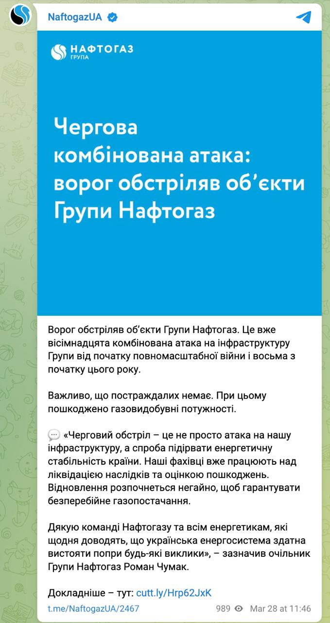 12:39 "Нафтогаз" заявил о повреждении обстрелом своих газодобывающих мощностей, что нарушает "энергетическое перемирие".