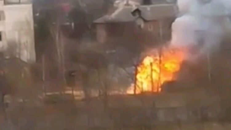 Судя по кадрам, после прилета ракеты по городу во дворе предприятия, расположенного среди жилой застройки, загорелись детонирующие вещества или предметы. Сначала они довольно сильно горели, затем начали раздаваться одиночные хлопки, а в конце записи произошел мощнейший взрыв.