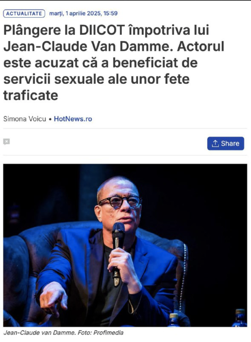 Самого Ван Дамма обвиняют в "использовании услуг лица, заведомо подвергающегося эксплуатации". В DIICOT подтвердили подачу жалобы, в которой фигурирует актер, а дело приняли к производству.