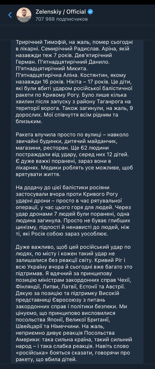 "К сожалению, неприятно удивляет реакция посольства Америки: такая сильная страна, такой сильный народ – и такая слабая реакция. Даже слово "русский" боятся сказать, говоря о ракете, убившей детей", - написал Зеленский.