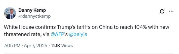 "Белый дом подтвердил, что тарифы Трампа на китайские товары достигнут 104% после угрозы поднять ставки", - говорится в сообщении.