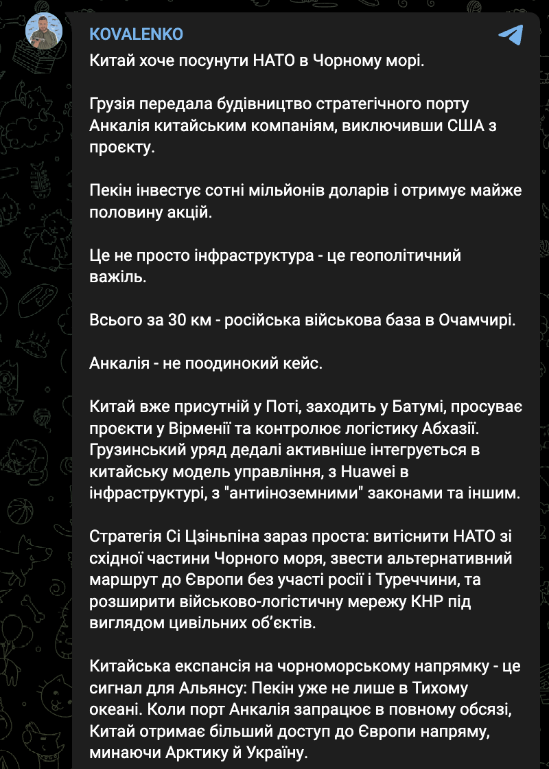 "Стратегия Си Цзиньпина сейчас проста: вытеснить НАТО с восточной части Черного моря, свести альтернативный маршрут в Европу без участия России и Турции и расширить военно-логистическую сеть КНР под видом гражданских объектов", - написал главный по "дезинформации" в украинском Совбезе.