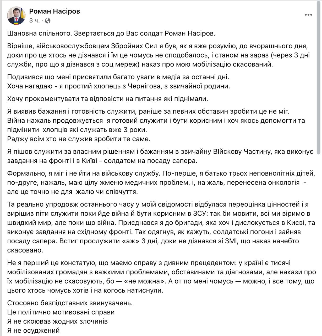 "Я изъявил желание и готовность служить, раньше при определенных обстоятельствах сделать это не мог. Война, к сожалению, продолжается, я готов служить и быть полезным и хоть как-то помочь и подменить ребят, которые служат уже 3 года. Я пошел служить по собственному решению и желанию в обычную военную часть, выполняющую задачи на фронте и в Киеве – солдатом на должность сапера", - пишет Насиров.