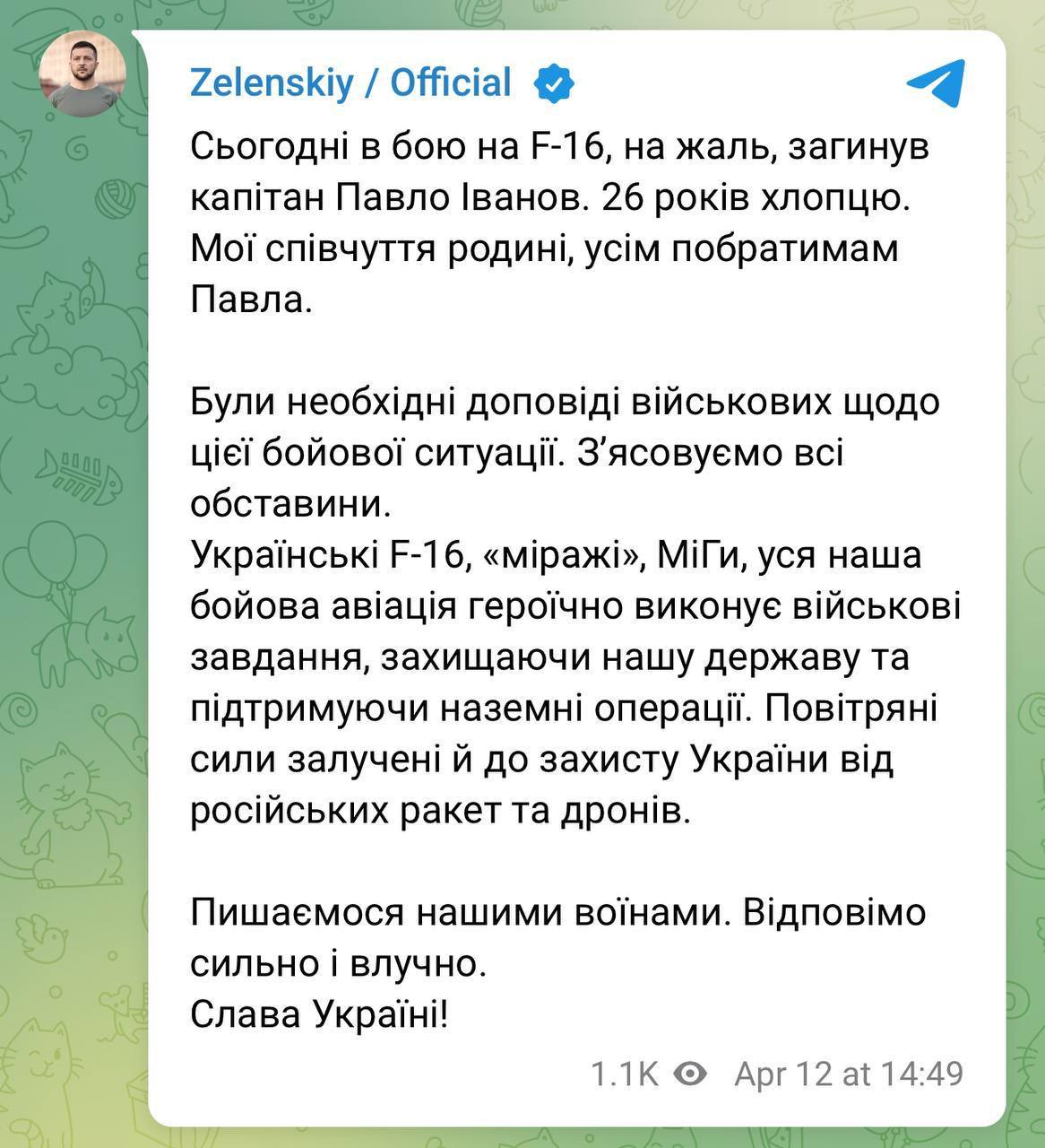 15:20 Зеленский также написал о гибели украинского пилота Павла Иванова на F-16.