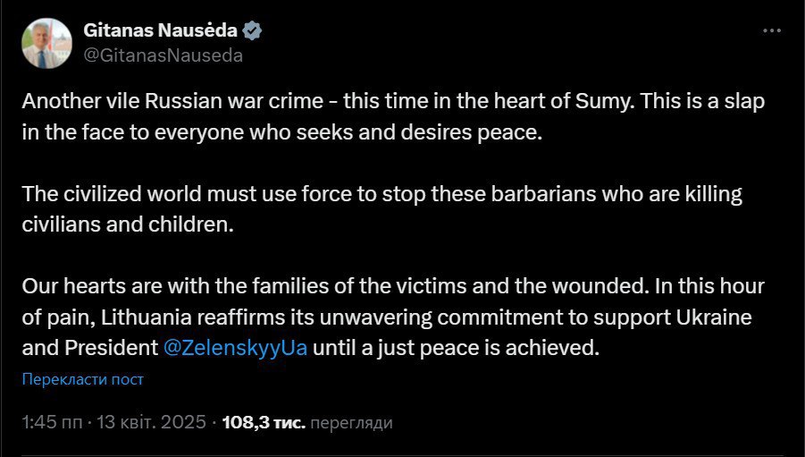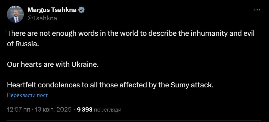 Другие мировые лидеры также отреагировали на обстрел города Сумы. Соболезнования выразили президенты Литвы Гитанас Науседа и Молдовы Майя Санду, а также глава МИД Эстонии Маргус Тсахкна.
