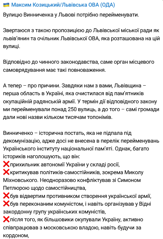 Глава Львовской областной военной администрации Максим Козицкий предлагает переименовать улицу во Львове, названную в честь первого премьер-министра Украинской народной республики Владимира Винниченко.