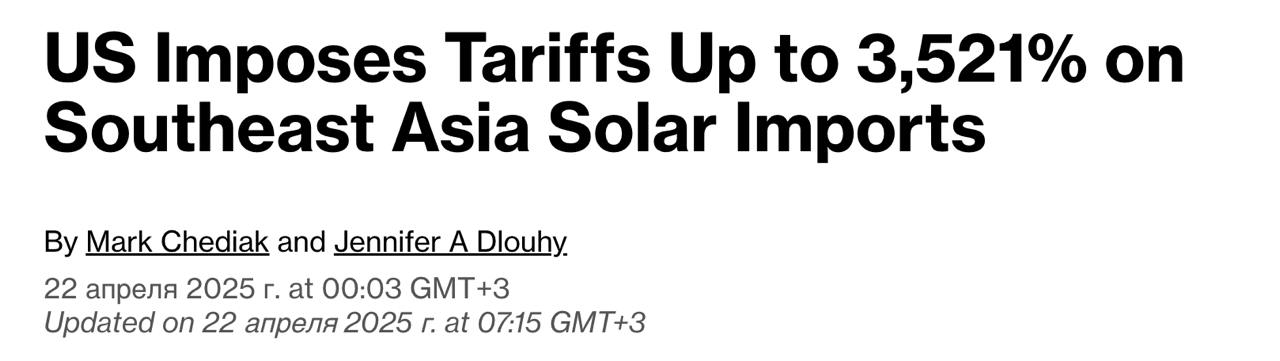 Решение американских властей ввести астрономические пошлины стало результатом расследования, начатого еще при Джо Байдене. Оно установило, что импортируемые из указанных стран солнечные элементы поступают на рынок США по демпинговым ценам, к тому же производители солнечных панелей получали государственные субсидии от китайского правительства.