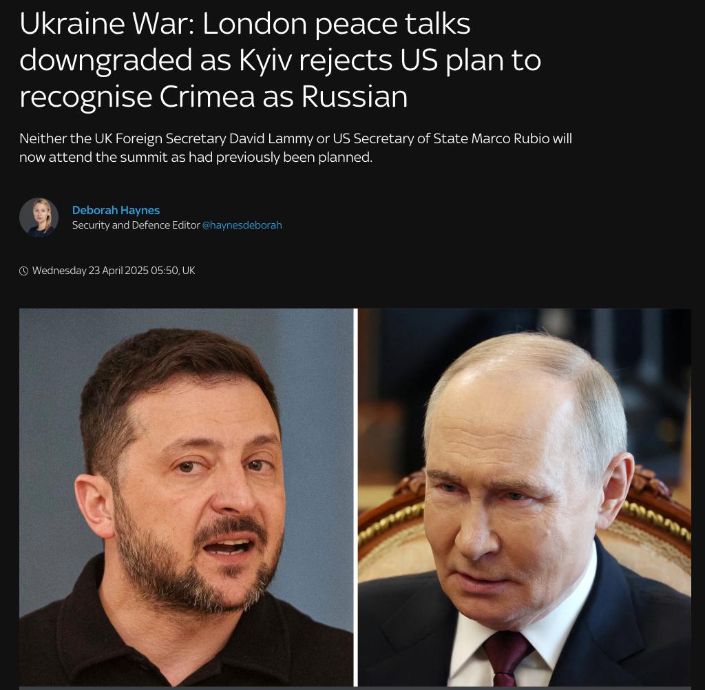 "Мирное предложение США, которое должно обсуждаться в Лондоне, предполагает, что Соединенные Штаты признают незаконную аннексию Крыма Россией, что было отвергнуто Владимиром Зеленским во вторник", - говорится в обзоре Sky News.