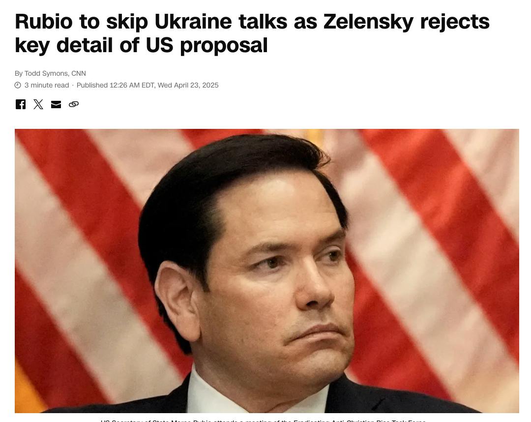Рубио принял решение пропустить следующий этап переговоров "в то время как Украина отвергла одно из ключевых предложений президента Трампа".