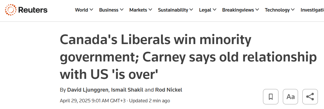 Во-вторых, президент США Дональд Трамп начал заявлять об аннексии Канады и ввел против нее пошлины, что вызвало среди канадцев рост антиамериканских настроений. И именно на противостоянии Трампу сделал упор в своей кампании Карни. Он даже говорил, что Канада может перехватить мировое лидерство у США. Это и позволило правящей партии, вопреки всем прежним прогнозам, занять первое место на выборах.