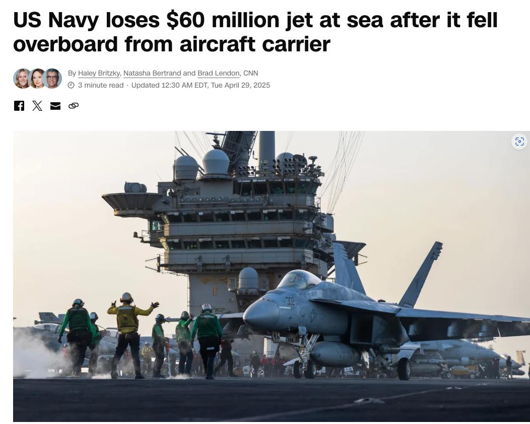 Напомним, вчера истребитель американского авианосца упал в море в зоне боевых действий против хуситов.