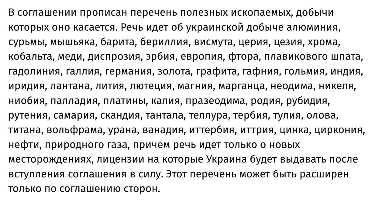 Однако соглашение не касается доходов от украинской инфраструктуры, как хотели США, а только 57 минералов (на скриншоте). Речь идет только о новых месторождениях, лицензии на которые Украина будет выдавать после вступления соглашения в силу. Этот перечень может быть расширен по соглашению сторон.