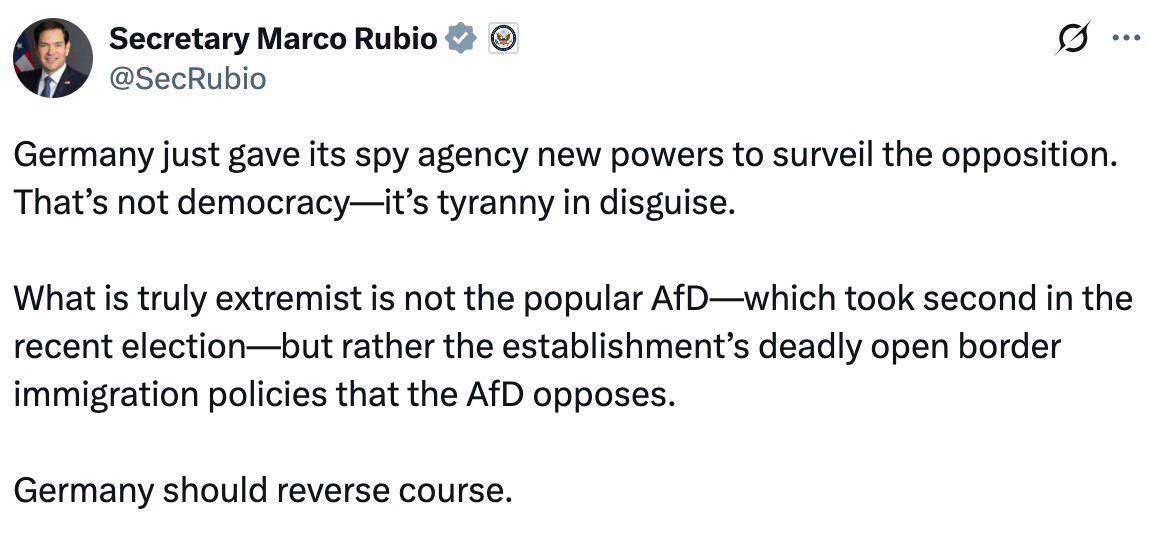 "Германия только что предоставила своему шпионскому агентству новые полномочия для слежки за оппозицией. Это не демократия - это замаскированная тирания. Что действительно является экстремистским, так это не популярная "Альтернатива для Германии", занявшая второе место на недавних выборах, а скорее смертоносная политика открытых границ иммиграции, против которой выступает "Альтернатива для Германии". Германия должна изменить курс", - написал Рубио в своем аккаунте в Х.