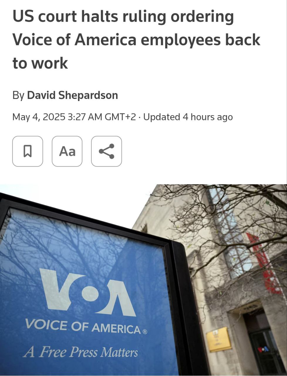Федеральный апелляционный суд США в субботу отменил решение окружного суда, который 22 апреля потребовал вернуть на работу сотрудников "Голоса Америки" и возобновить трансляцию, а также выдачу грантов этому СМИ.