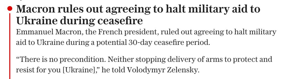 19:32 Макрон исключил согласие на прекращение военной помощи Украине во время прекращения огня.