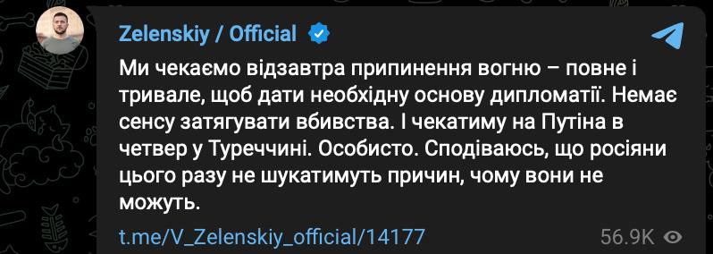 При этом из цитаты Зеленского не до конца ясно, поедет ли он в Стамбул, если прекращение огня завтра не наступит.