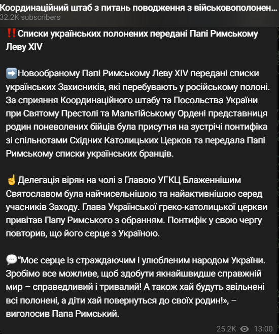 Папе римскому Льву XIV передали списки находящихся в плену украинских военных, находящихся в российском плену.