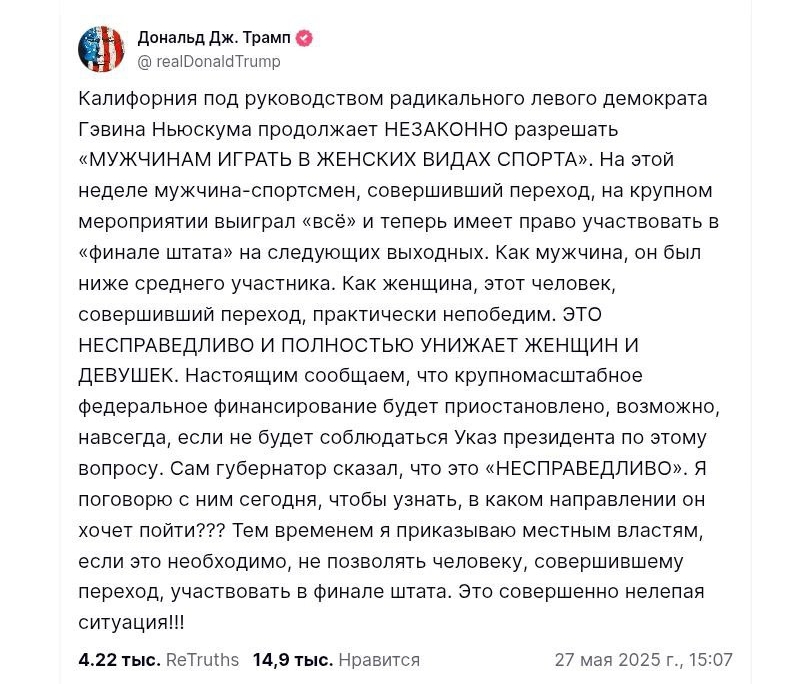 "На этой неделе мужчина-спортсмен, совершивший переход, на крупном мероприятии выиграл "все" и теперь имеет право участвовать в "финале штата" на следующих выходных. Как мужчина, он был ниже среднего участника. Как женщина, этот человек, совершивший переход, практически непобедим… Настоящим сообщаем, что крупномасштабное федеральное финансирование будет приостановлено, возможно, навсегда, если не будет соблюдаться указ президента по этому вопросу", - написал американский лидер в социальной сети Truth Social.