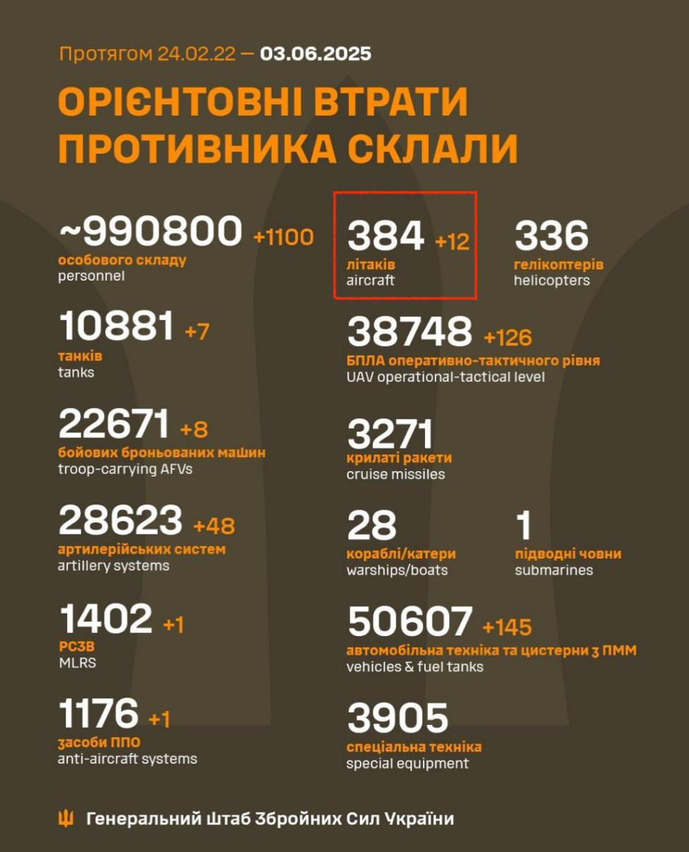 "После обработки дополнительной информации из различных источников и ее верификации, что потребовало определенного времени, сообщаем, что общие потери РФ составили 41 военный самолет, среди которых стратегические бомбардировщики и другие виды боевых воздушных судов", - говорится в сообщении.