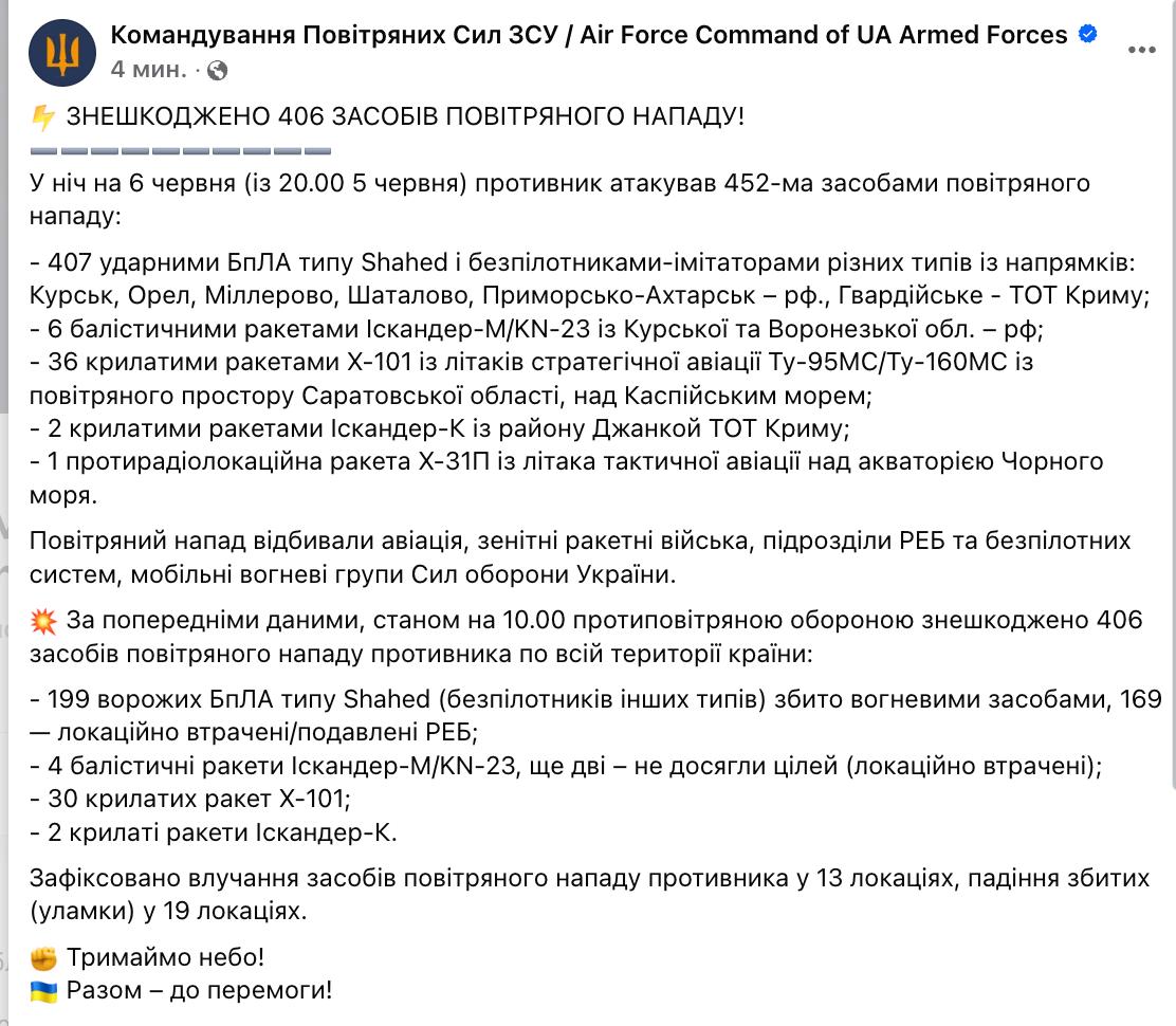 Также было запущено 407 беспилотников, из которых 199 были сбиты, а ещё 169 подавлены или потеряны в результате работы средств радиоэлектронной борьбы.