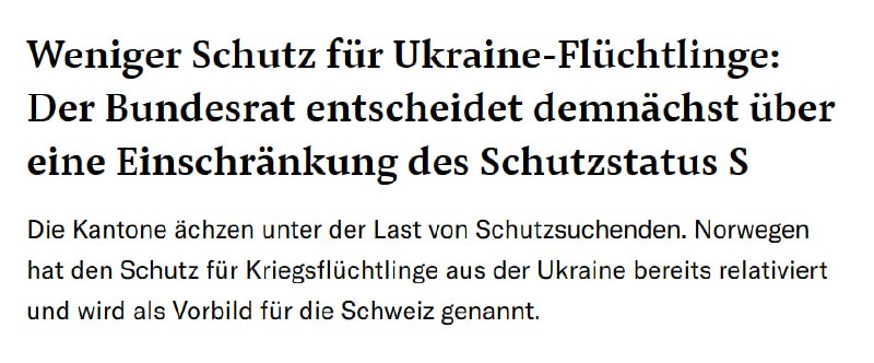 Швейцарская народная партия (ШНП) внесла в Национальный совет предложение ужесточить предоставление статуса защиты S для украинских беженцев, аргументируя это тем, что ситуация на значительной части территории Украины стабилизировалась и там нет боевых действий.