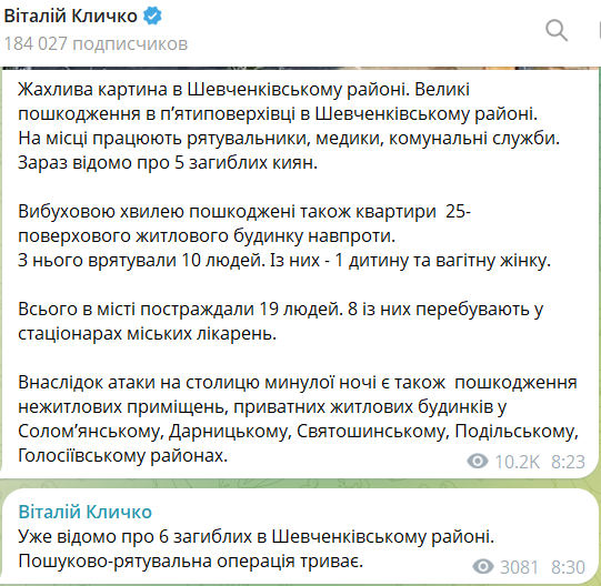 По словам мэра Виталия Кличко, в Киеве в ходе ночного удара погибли шесть человек и разрушен подъезд многоэтажки в Шевченковском районе. Ранены 19 человек. Продолжается спасательная операция.